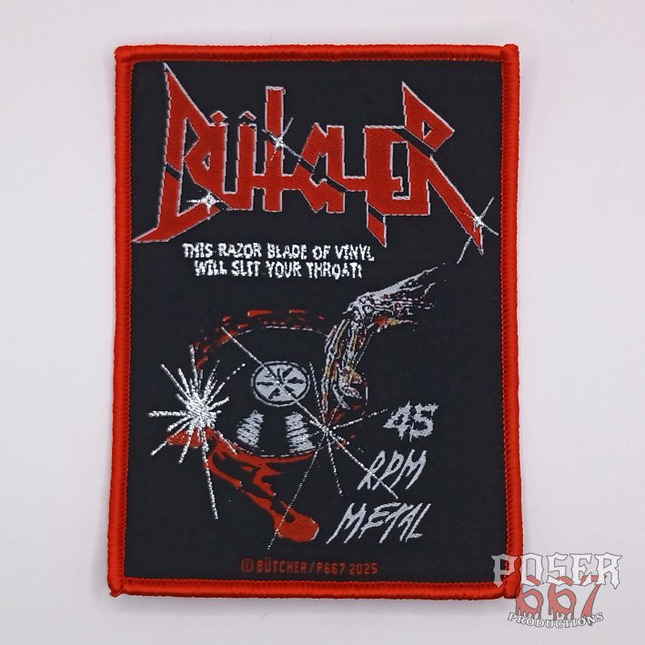 since then, they’ve released a few demos and three albums. And since our paths crossed from time to time at festivals and club shows, we thought we should do something together… and at some point, we had the idea to make a cool 3D pin… but for now, there’s the Bütcher patch – 45 RPM Metal, because it’s a great song and the motif just has to be woven 😉