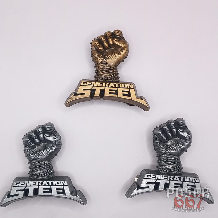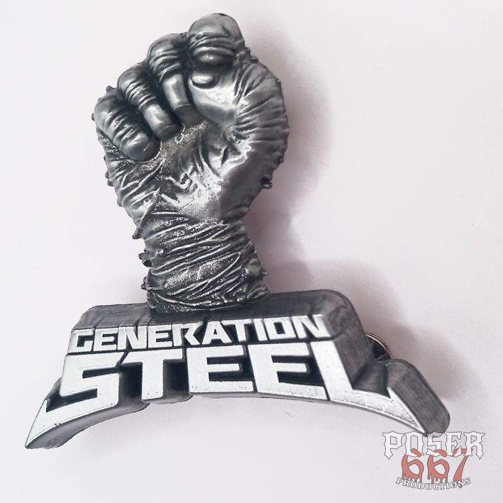 Für Generation Steel´s Debut Album “The Eagle Will Rise”, ein ordentliches Stück Stahl, haben wir bereits einen 3D Pin gemacht, wir haben für die jungen Männer auch schon Patches gemacht…es gibt mittlerweile auch etwas mehr material, verpackt in einem weiteren Album und 2 EP´s und das Cover von einer dieser EP´s haben wir nun zum 3D Pin verwandelt… das Ergebniss ist der Generation Steel Pin – STEELERS FIST