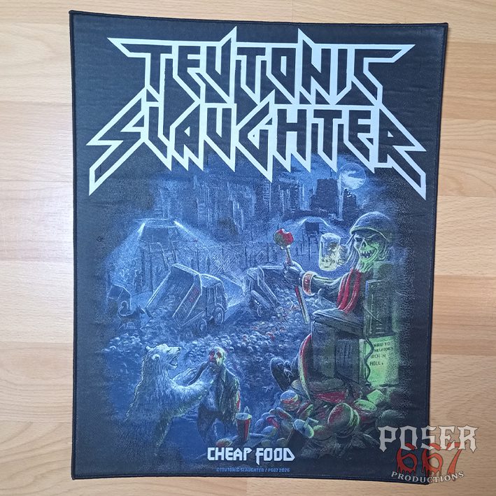 Teutonic Slaughter ist eine Thrashmetal Band aus Gladbeck, die sich im Jahr 2011 gegründet hat. Die Band hat neben vielen Gigs bisher einige EP´s, einer Split mit Darkness, dieses Jahr ihr 3. Album, Cheap Food herausgebracht. Wir wurden gefragt, ob wir einen Backpatch mit dem Cover machen können und hier ist das Ergebniss, der Teutonic Slaughter Backpatch – Cheap Food.
